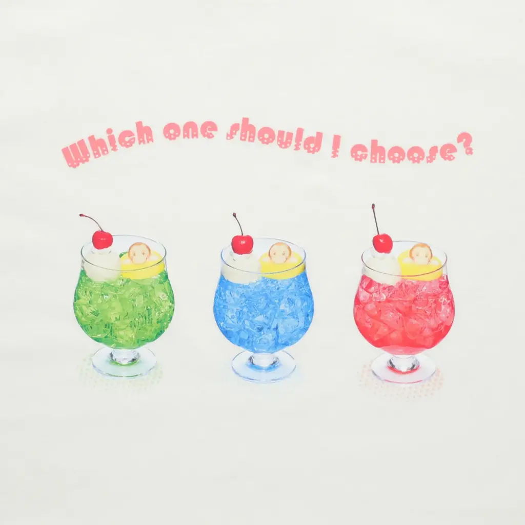 - メニューTシャツ クリームソーダ:表面にカラフルな3種のクリームソーダをデザイン、背面上部にはフルーツに囲まれたジョージのイラスト。カラーやモチーフでかわいらしい印象に。サイズはハンバーガー同様の3サイズ展開、素材:綿。