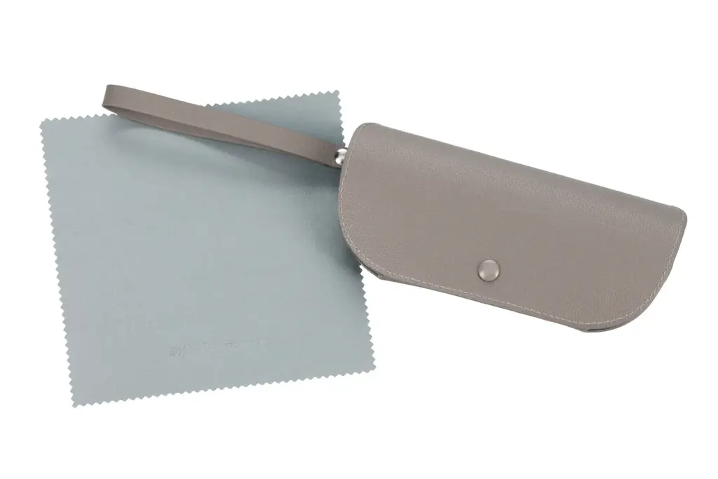 各モデルには共通でオリジナルケースと巾着型のメガネ拭きが付属します。ケースとポーチはニュアンスカラーで上品な佇まいに仕上げられており、コンパクトな形状にストラップが付いて持ち運びに配慮されています。