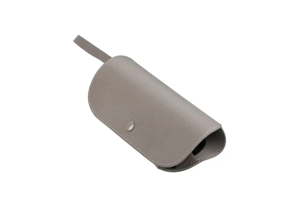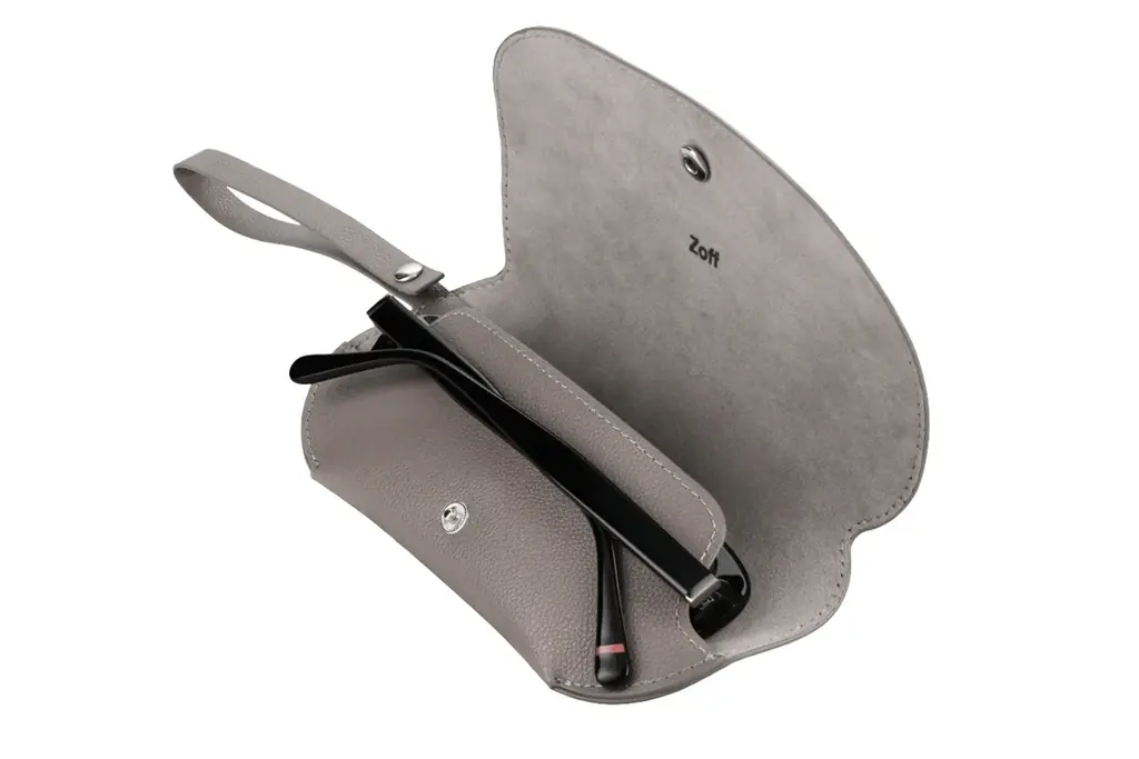 付属のケースとメガネ拭きはセットで提供されます。素材感や色味はコレクション全体のトーンに合わせたニュアンスカラーで統一され、携帯時の使い勝手を考慮してコンパクトな形状とストラップが備えられています。