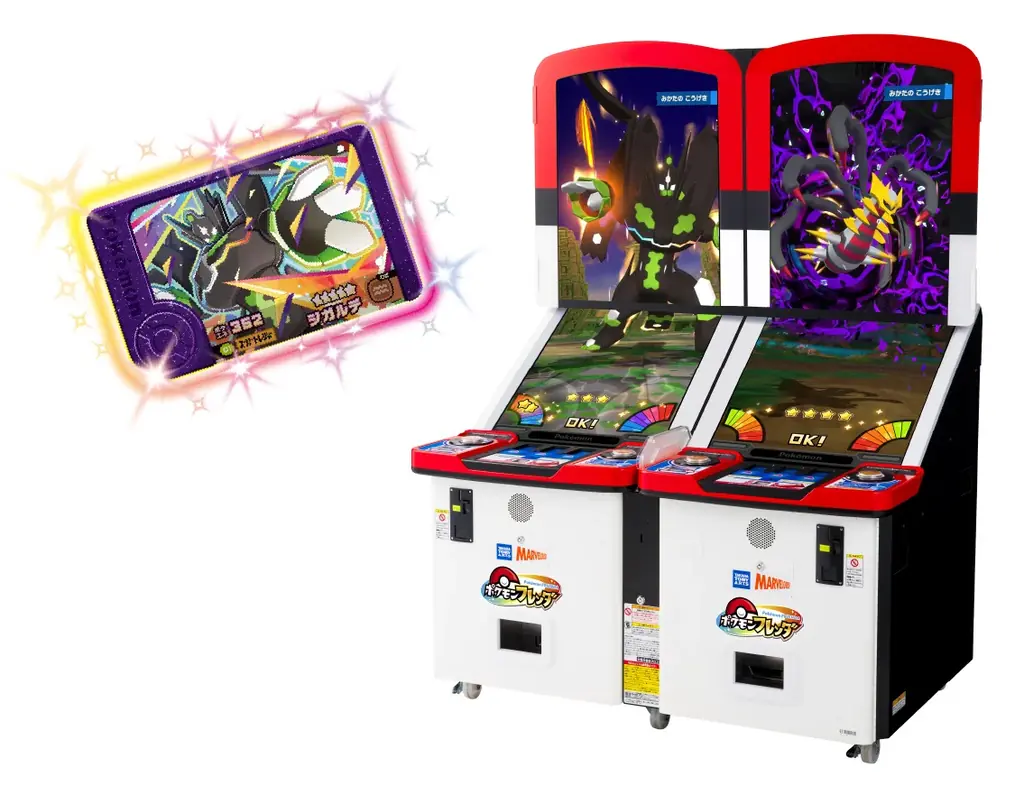 『ポケモンフレンダ』は、ポケモンとバトルをして捕まえ、筐体から配出される「フレンダピック」を集める業務用のキッズアミューズメントマシンです。1台で1~2人のプレイに対応する「ツイン筐体」を基本とし、隣り合った画面が繋がる「タッグプレイ(同時プレイ)」が発生すると、筐体上部と中央部の2台の大型モニターで連動した大迫力のバトル演出が表示されます。