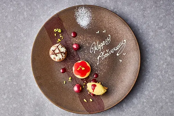 デザートはドイツ発祥の伝統菓子『フォレノワール』を一口大の小菓子風にアレンジして提供します。デザートプレートにはメッセージを添えて提供されるため、記念日や誕生日などの用途に合わせた演出が可能です。