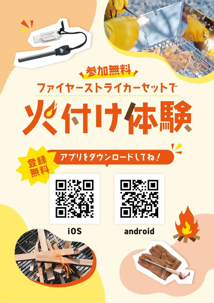 - ファイヤーストライカーセットで火付け体験ワークショップ: スタッフによるサポート付きで、初心者でも参加できる火起こし体験を実施。防災や緊急時のスキルとしても学べます。
