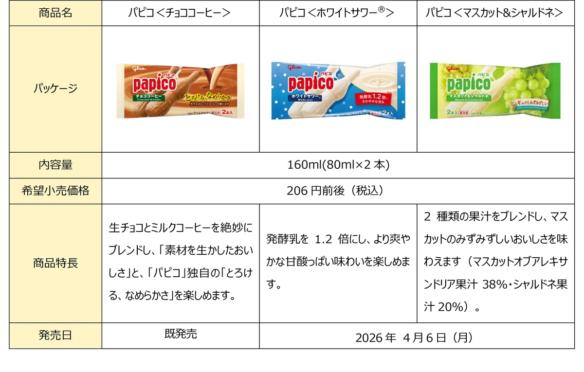 | ブランドサイト/公式X | ブランドサイト:https://jp.glico.com/ice/papico//公式X:https://x.com/PAPICO_JPN(@PAPICO_JPN) |