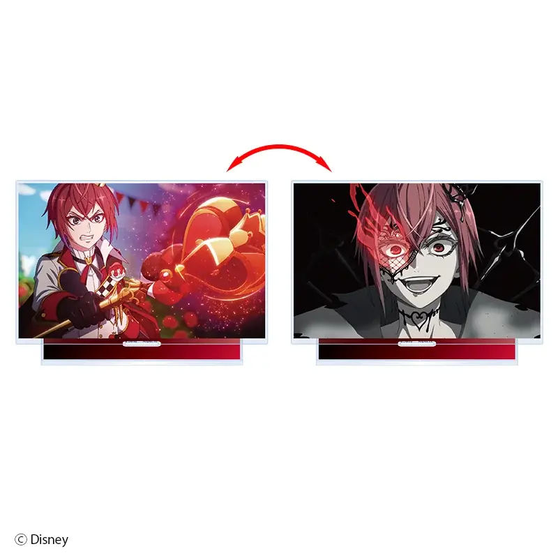 『ディズニー ツイステッドワンダーランド ザ アニメーション』のオーバーブロットの場面写真を使用したレンチキュラーアクリルスタンド。角度でイラストが変化し、1つで2柄楽しめます。材質はアクリル樹脂、PET。本体:約W150×H100mm、台座:約W120×H40mm。ご購入制限はお一人様1種につき2点までです。