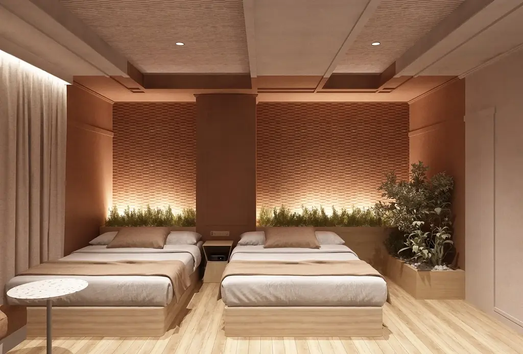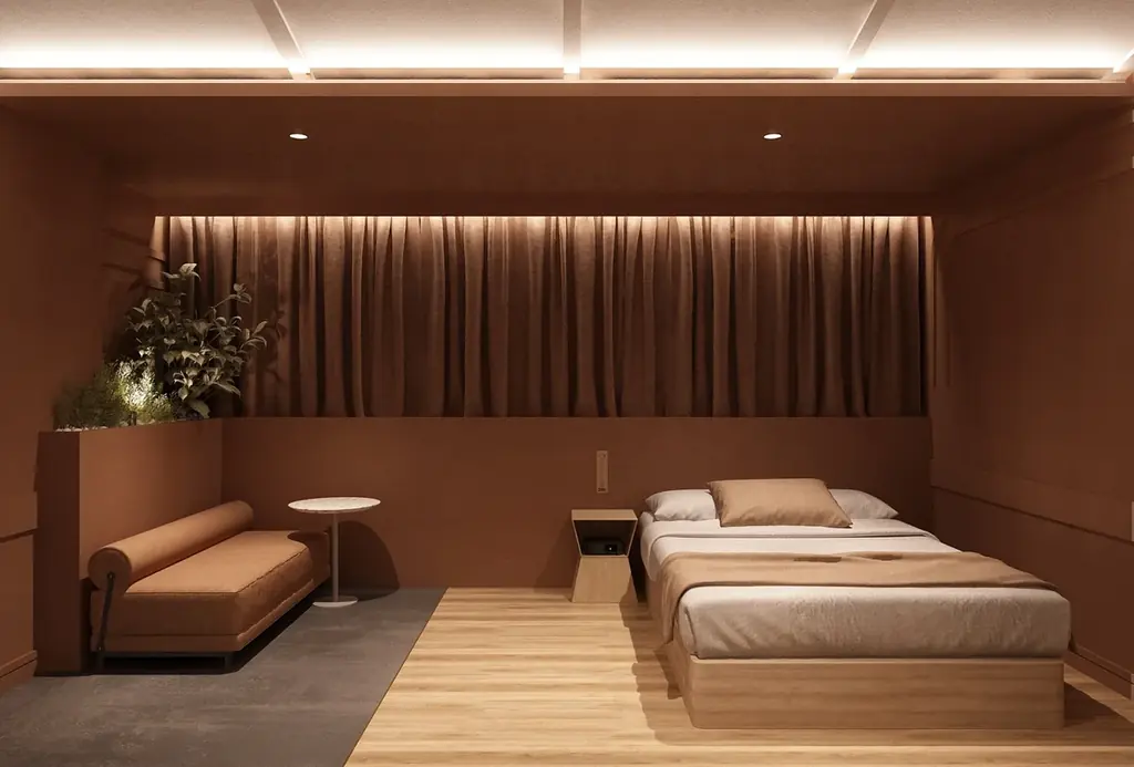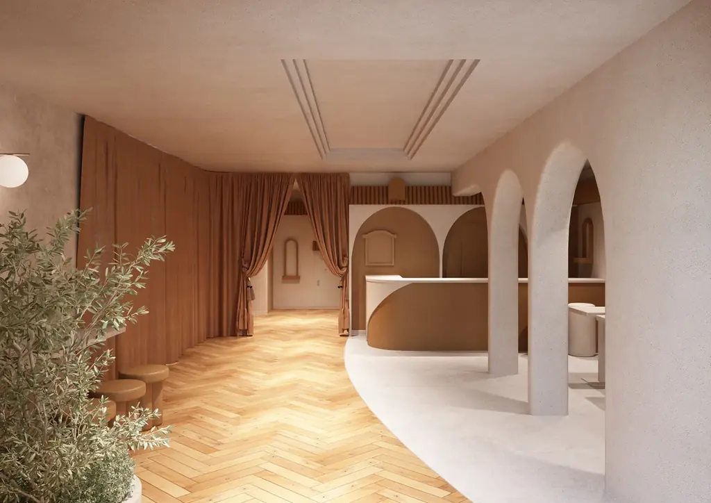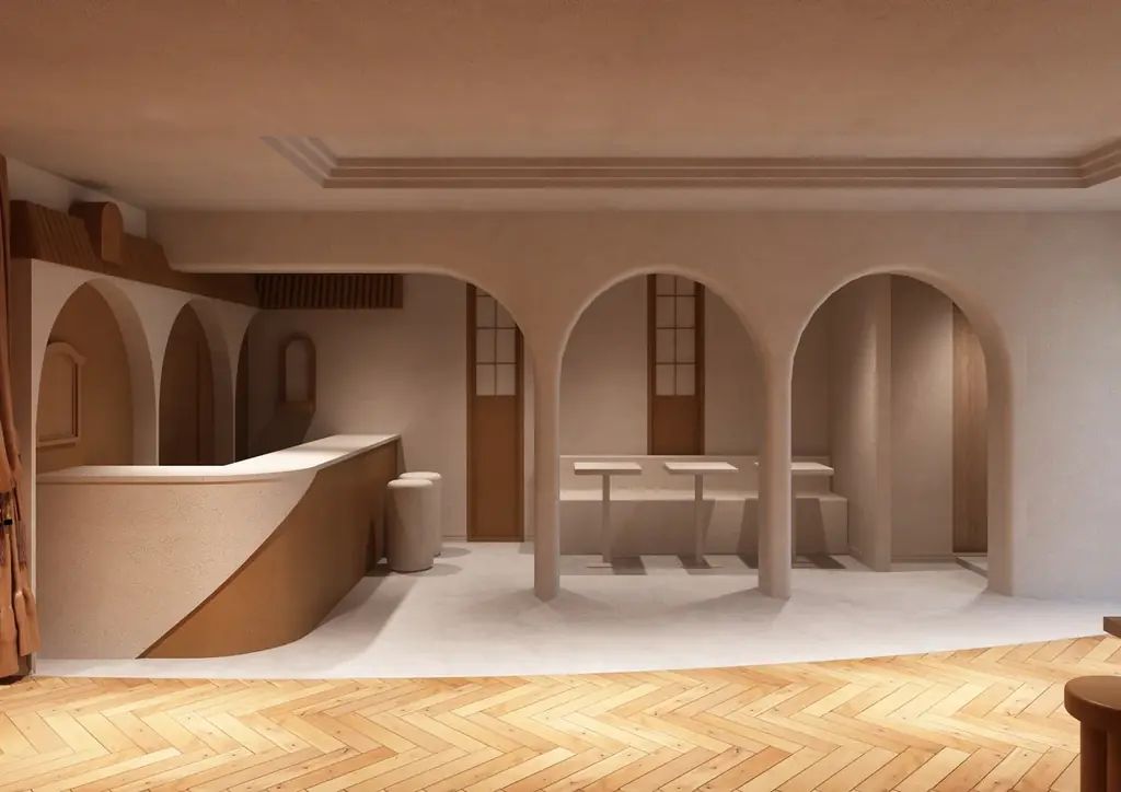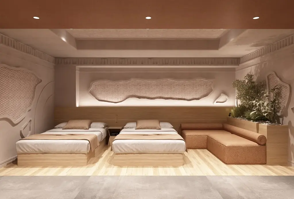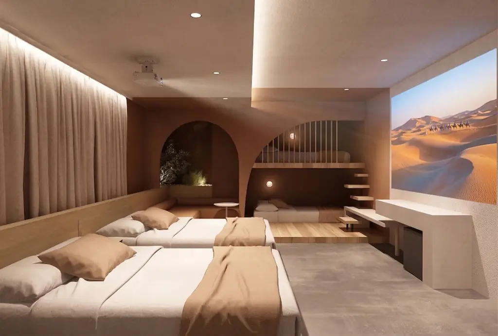 館内デザインはモロッコの砂漠風景に着想を得ており、やわらかな曲線と土の色合いを基調に、静けさを感じさせる空間構成を採用しています。客室やラウンジは単なる宿泊用途を超え、感性をゆっくりほどいていくための場として設計されています。