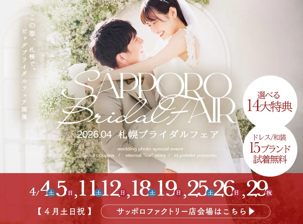 以上が発表資料に基づく「札幌ブライダルフェア」の概要と主な情報の整理です。イベントは衣装の試着や専門カウンセリング、フェア限定の割引・サービスを通じて、個々の要望に応じたフォトウエディングの提案を行う内容になっています。詳細や予約、特典の適用条件などは公式ページおよび各店舗への問い合わせで確認することが適切です。