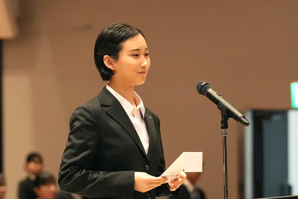 新入社員代表として石井晶さん(ホテリエ)が登壇し、次のように決意を述べています。石井さんは主体的に学び挑戦を続ける姿勢と、会社の一員として責任を持って行動すること、そしてお客様に心からの満足と感動を届ける存在になるために日々努力する旨を表明しました。