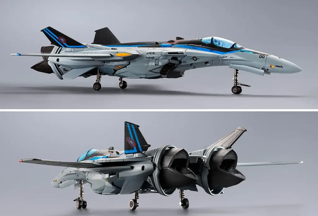 ファイター形態は『トップガン マーヴェリック』の愛機を彷彿とさせるカラーリングを踏襲しつつも、VF-25らしさを残すデザインに整えられています。機首から主翼、尾翼に至るまで均整のとれたプロポーションを維持し、模型としての鑑賞価値も重視されています。
