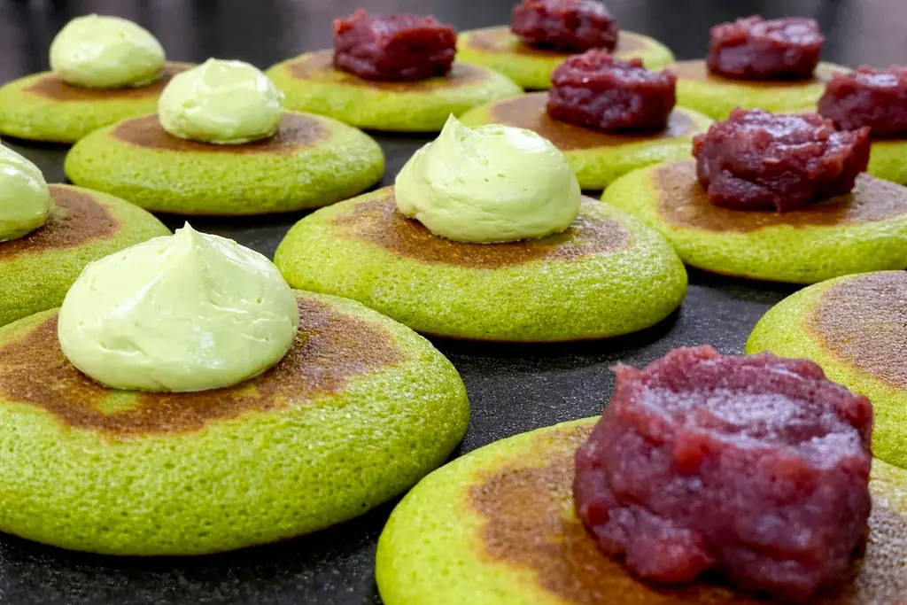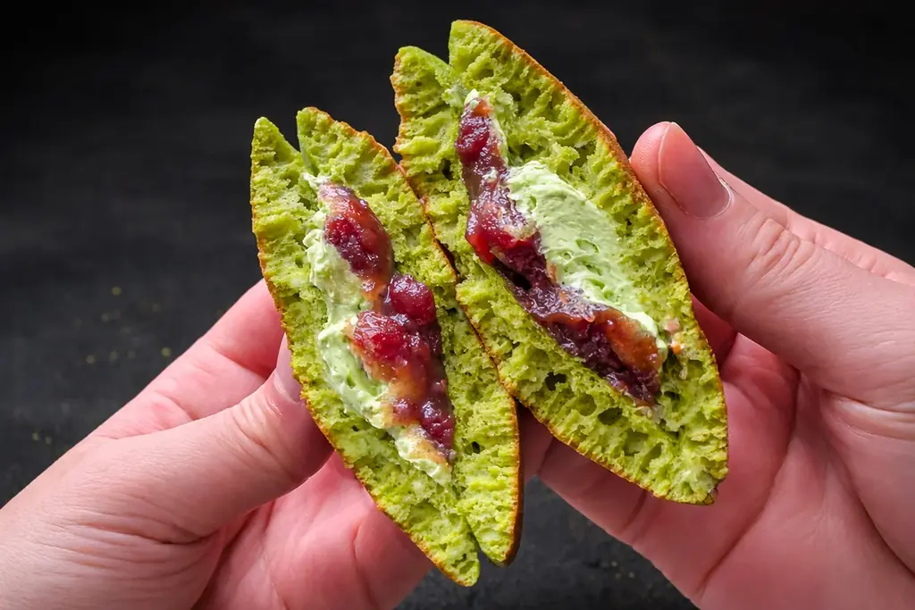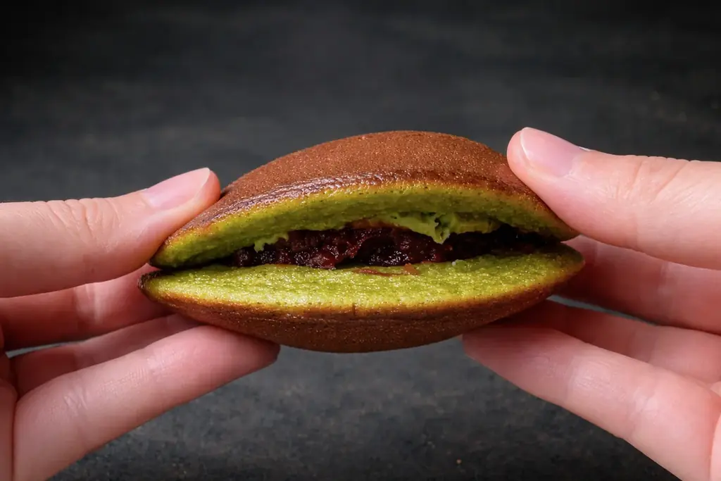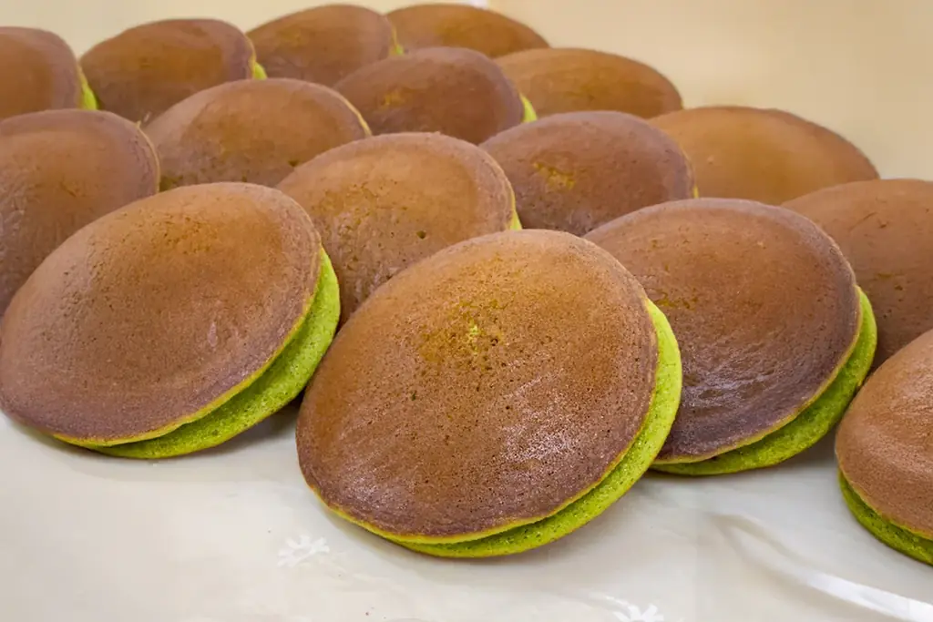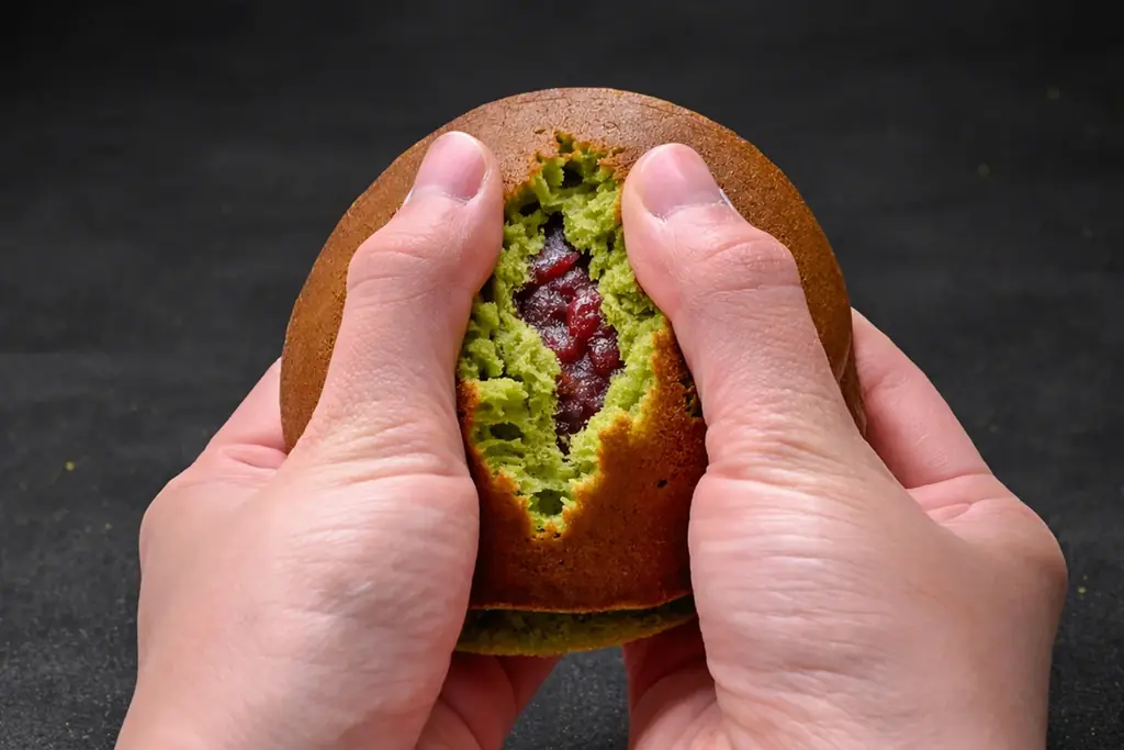 製法上の特徴として、焼く前に一晩生地を寝かせて水分を全体に行き渡らせる工程、そして生地に少量の日本酒を加えることによる旨味としっとり感の付与があります。焼き加減は職人の熟練で管理され、表面に香ばしい焼き色をつけつつ、内側に抹茶の深緑を残すことを実現しています。