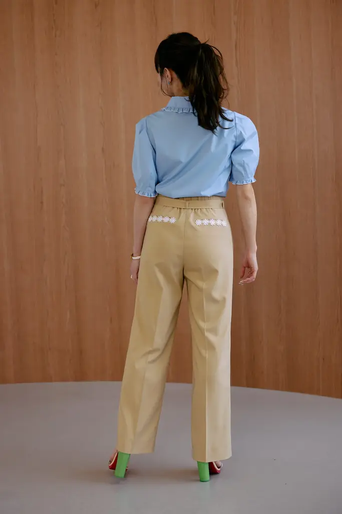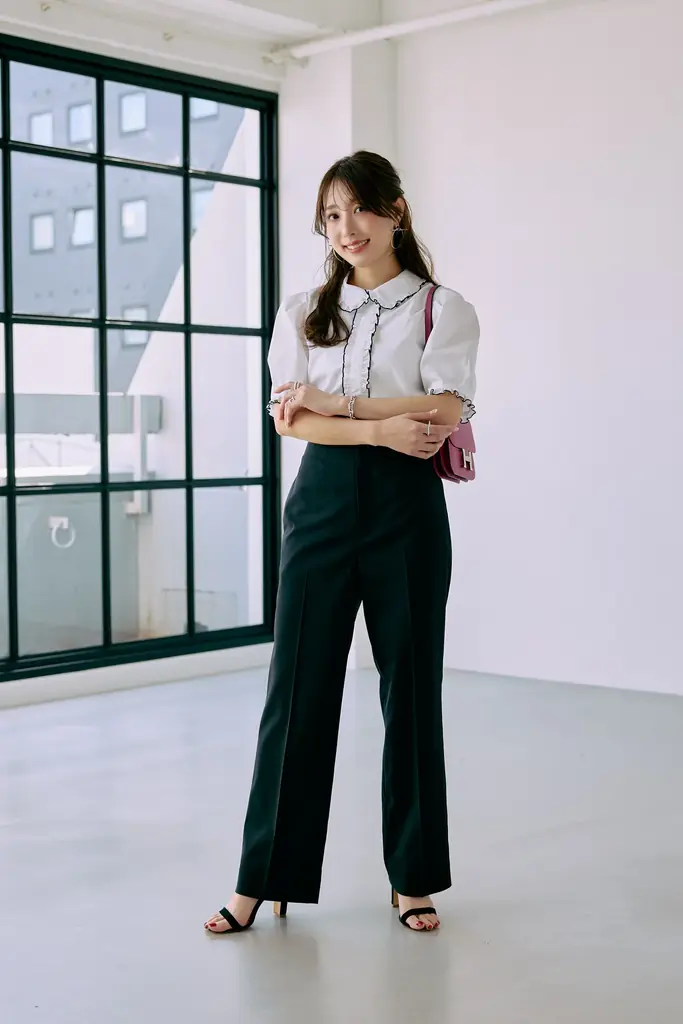 ブラウススタイルを引き立てる、洗練された美シルエットのストレートパンツです。ハイウエスト設計により腰位置が高く見え、脚のラインをまっすぐに美しく見せることを重視した作りになっています。