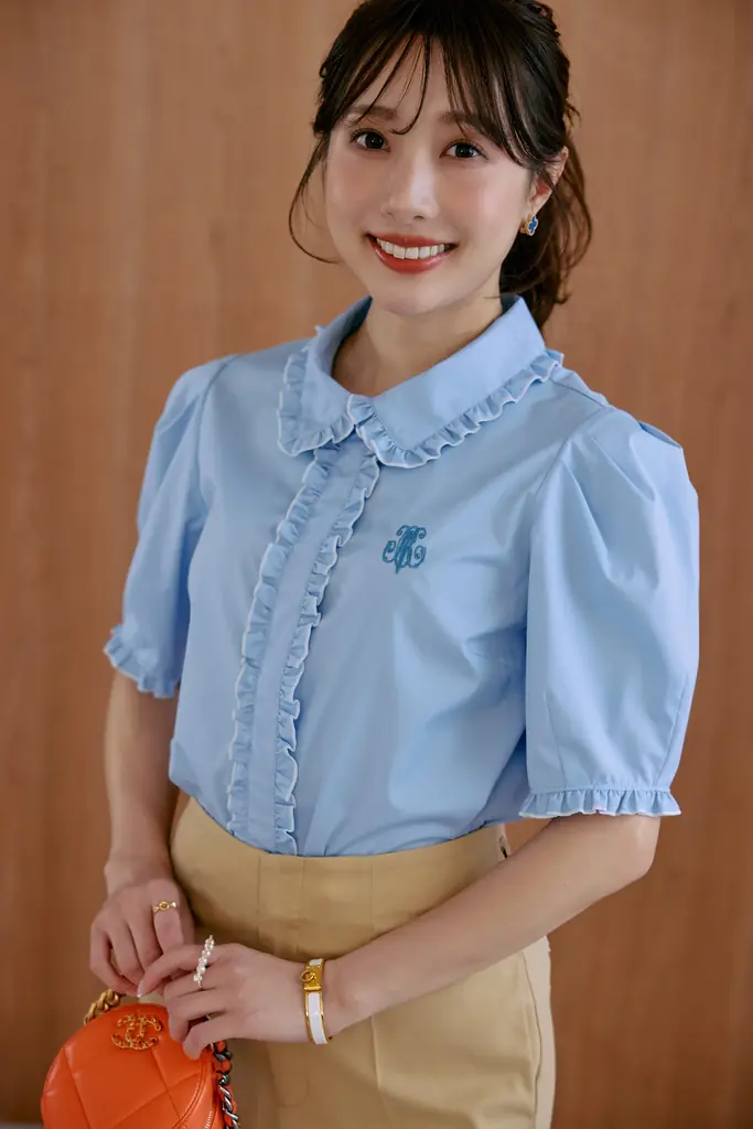 ストレッチ性を備えたハリのある素材で作られたブラウス。立体的なシルエットと快適な着心地を両立しており、胸元にはブランドロゴの刺繍が入ります。襟と袖口には小ぶりなフリルとメローが配され、甘さを抑えつつ華やかな印象を与えるデザインです。