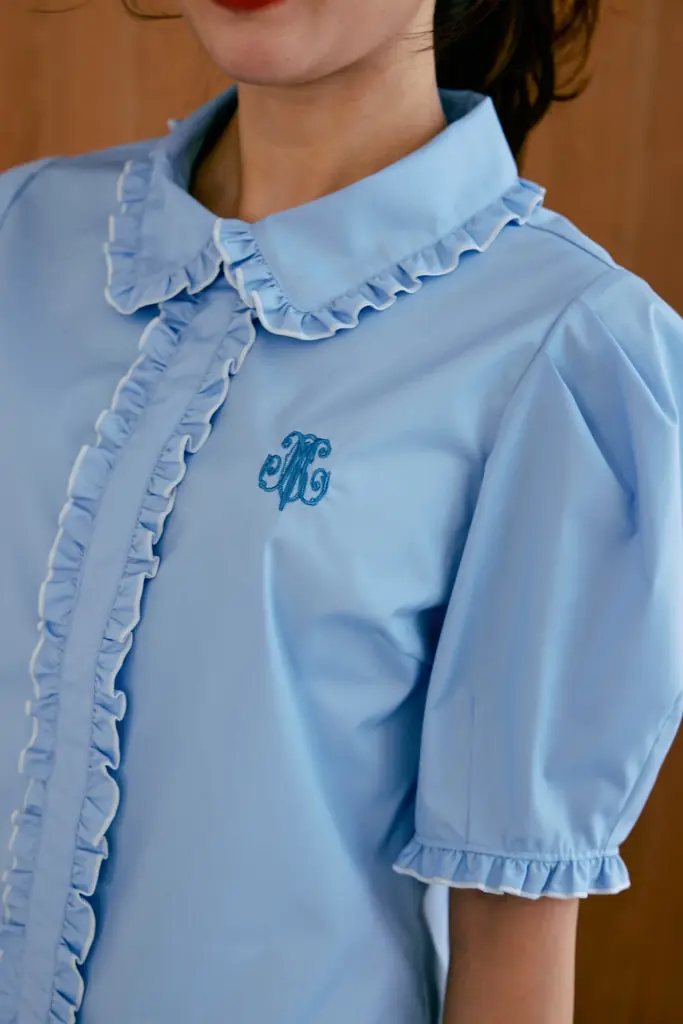 華やかフリルカラーロゴ刺繍ブラウス(サックス/ホワイト)