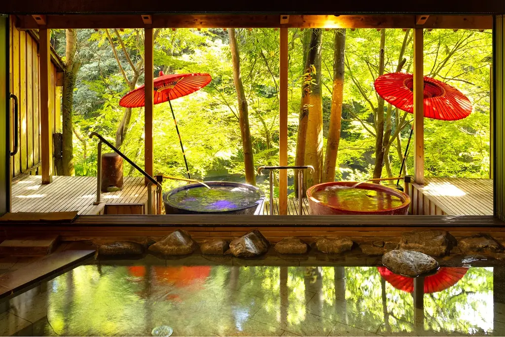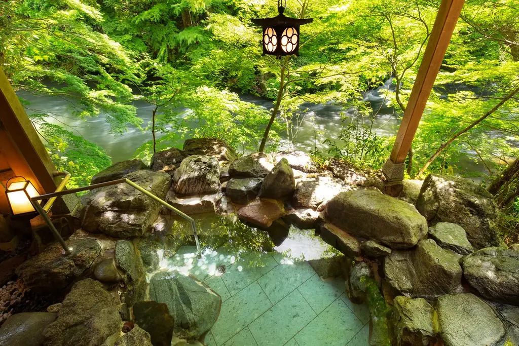 山中温泉は開湯1300年を数え、松尾芭蕉が扶桑三名湯の一つに挙げた歴史ある温泉地です。鶴仙渓1.3kmの遊歩道や総檜造りのこおろぎ橋、川床(4〜11月)など四季折々の景観が楽しめます。館内には山中塗、九谷焼、加賀水引などの伝統工芸品が配され、ミシュランガイド北陸版で三つ星を獲得した実績もあります。