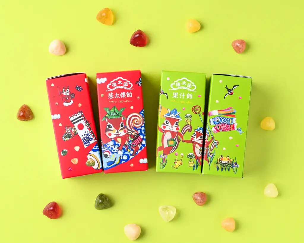 | パッケージの特色 | 赤色箱(榮太棲飴)の鯉のぼりデザイン、黄緑箱(果汁飴)の5月の景色と動物たちの描写 |
