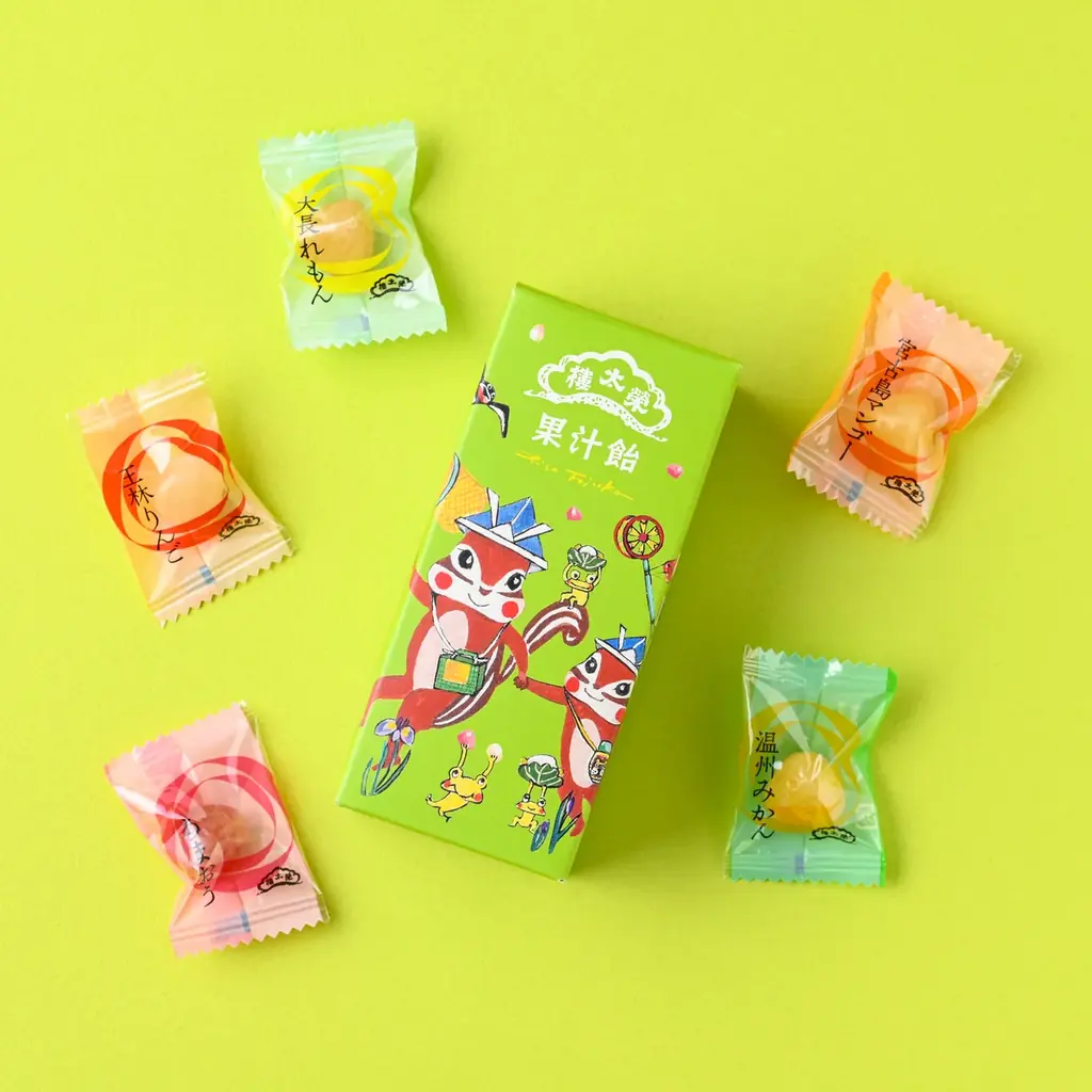 黄緑色の箱(【果汁飴】)は「こどもの日」に紙の兜を被るリスの兄弟が虫取りに向かう光景、5月の春の景色として菖蒲やツバメ、鯉のぼりに乗るタヌキとキツネ、カエル・カタツムリ・ヘビなど多様な小動物が混在するお祝いの場面を描いています。全体として子どもらしさや季節感、賑やかさを意図したデザインです。