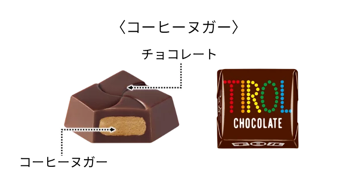 特徴:ほんのりビターなコーヒーヌガーとチョコレートの甘さが絶妙なバランスの定番。ヌガーの食感とコーヒーの苦みが根強い人気を保っています。