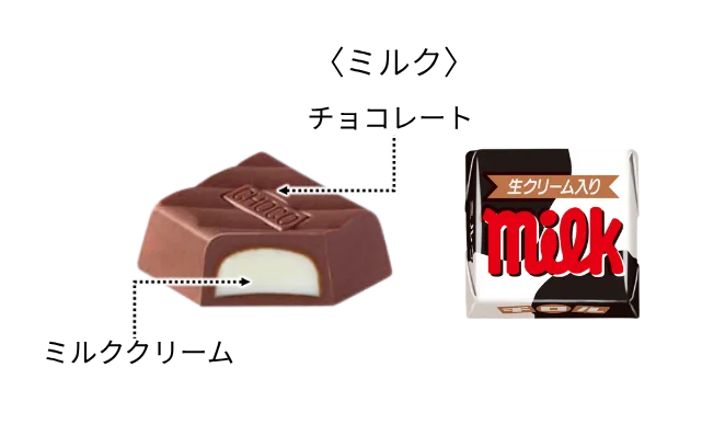 | フレーバー | ミルク(1990年登場、まろやか)、コーヒーヌガー(1979年登場、ほのかな苦みとヌガー食感) |