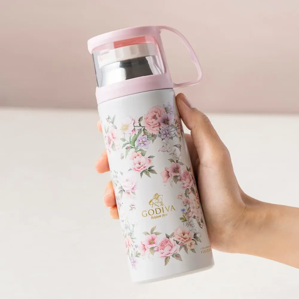 - ゴディバ オリジナルデザインのステンレスボトルをセット。オンライン版と店舗版の価格は共に5,400円(8%税込)です。