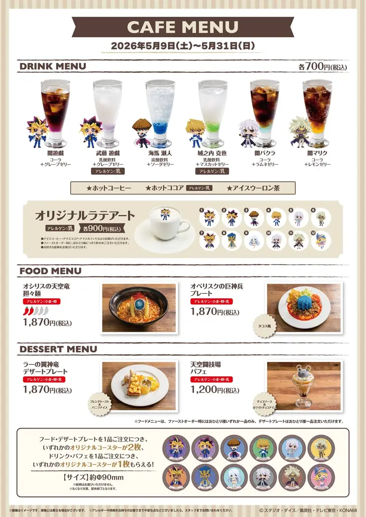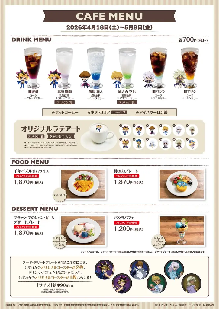 - ドリンク(各700円・税込):闇遊戯/武藤 遊戯/海馬 瀬人/城之内 克也/闇バクラ/闇マリク/ホットコーヒー/ホットココア/アイスウーロン茶