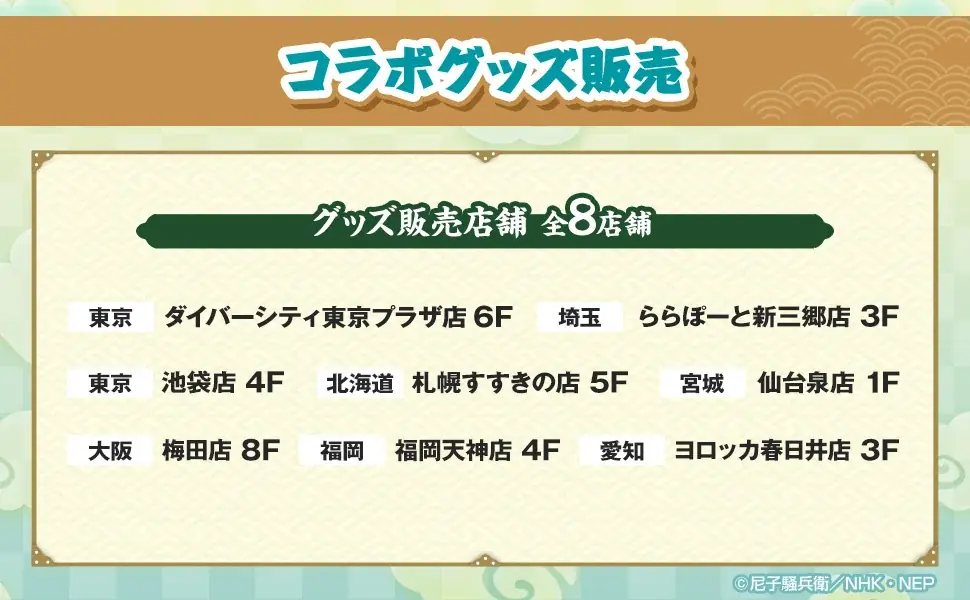- オリジナルグッズ販売店舗:上記8店舗のみ(札幌すすきの店、ダイバーシティ東京プラザ店、池袋店、吉祥寺店、ヨロッカ春日井店、梅田店、福岡天神店、仙台泉店)