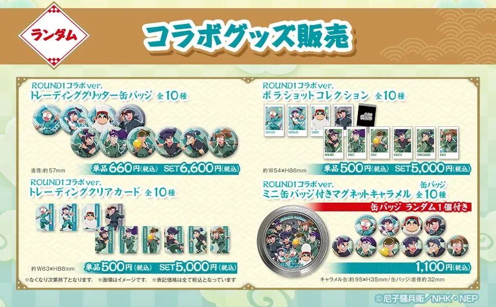 | オリジナルグッズ販売 | 一部のROUND1店舗(上記8店舗)で販売。通販あり(予約期間:2026年4月25日~2026年6月21日 23:59)。通販詳細:https://www.chugai-contents.jp/blog/event/nintama_round1/ |