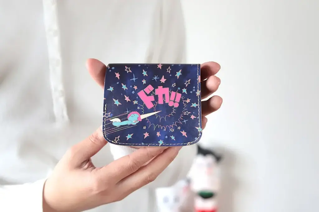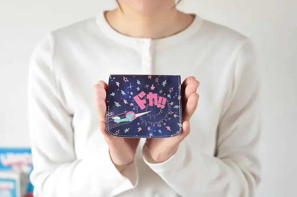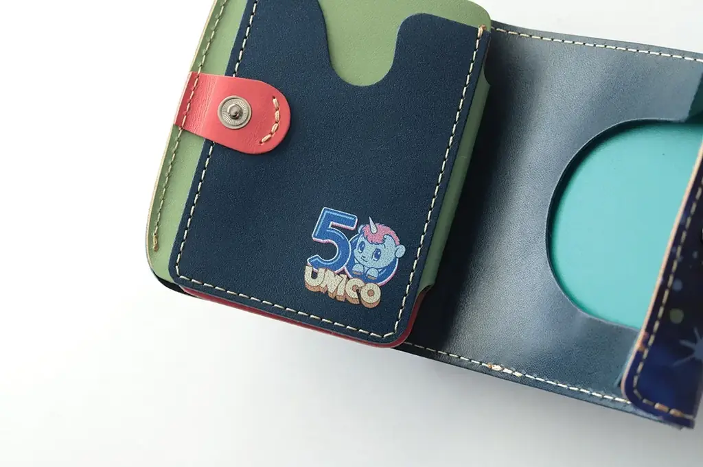 このモデルはレトロポップなタッチで描かれたユニコのイラストを外装に配したミニ財布で、表面は銀河を背景に戦うユニコ、背面には西風の精ゼフィルスをあしらっています。初回生産分100個は内側ポケットに『ユニコ生誕50周年ロゴ』を刻印した限定仕様で、限定分が終了した後は通常モデルを販売するとのことです。