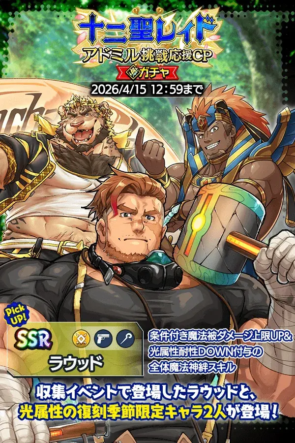 アドミル挑戦応援キャンペーンに合わせて、ガチャおよび複数の期間限定パックが登場しています。ガチャでは、『HAPPY イースター♪フェスティバル』で登場した「ラウッド」(光属性)の復刻に加え、光属性の復刻季節限定キャラクター2体が出る構成になっています。プレス発表では特にSSR魂友「ラウッド」の仕様が周知されています。