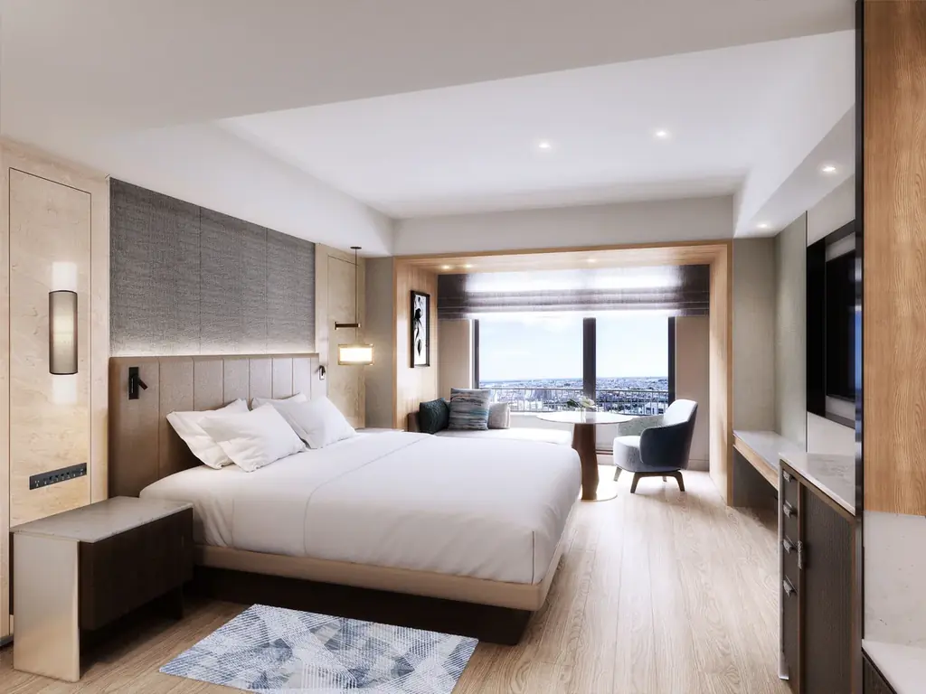 客室数は236室(スイートルーム含む)で、インテリアは浜松の織物文化と音楽文化に着想を得たものです。重なり合うテクスチャーや伝統的な織物を思わせるモチーフ、上質な素材が取り入れられ、落ち着きと洗練を兼ね備えた空間を目指しています。