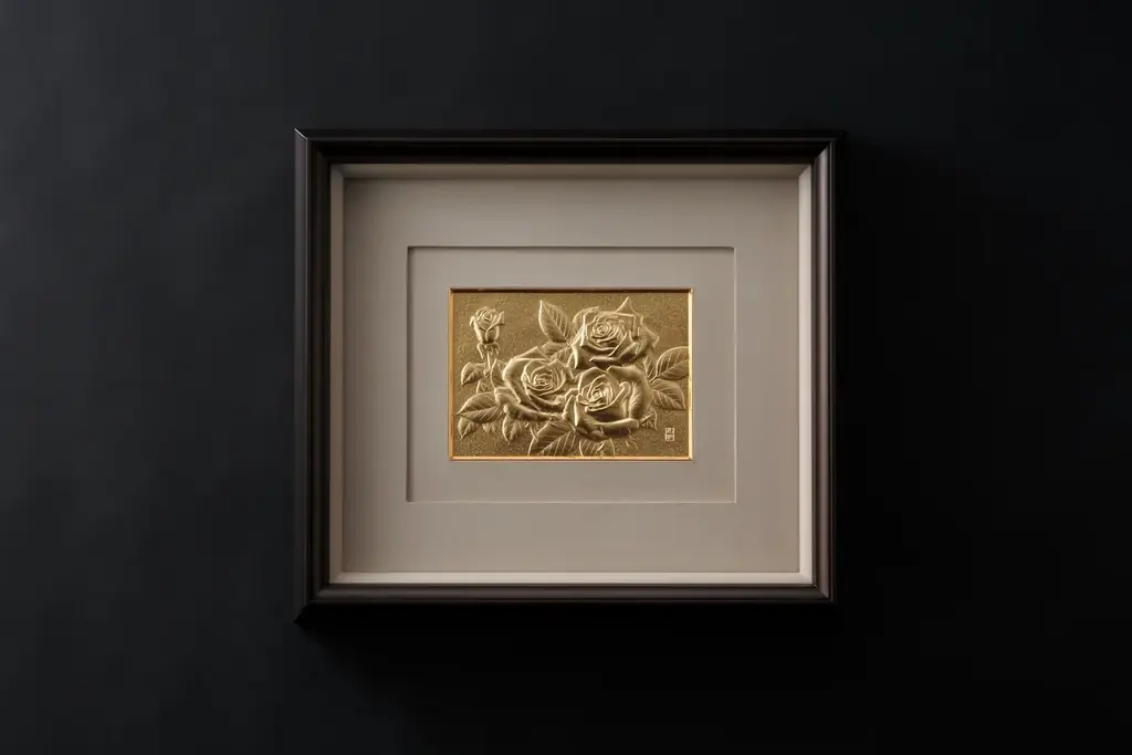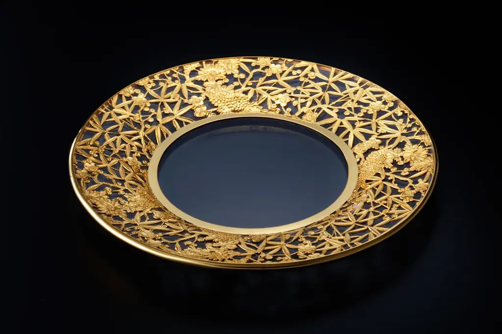 | 代表的な展示品(抜粋) | K24 額「薔薇」:重さ約50g 4,026,000円 K24 額「紫陽花」:重さ約50g 4,026,000円 K24 花づくし盃:重さ約120g 8,844,000円 K24 小箱 花菱文様:重さ約425g 32,879,000円 K24 キャンドルスタンド 椿:重さ約260g 20,064,000円 K24 トレー 竹菊:重さ約345g 26,389,000円 K24 円満「午」:重さ約5g 594,000円 K24 跳ね馬小判:重さ約28g 1,881,000円 |