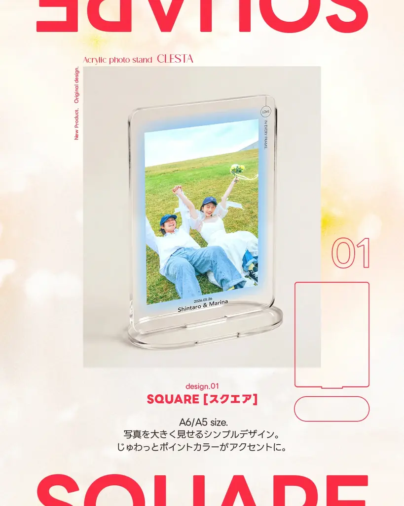 本製品は透明感のあるアクリル素材を用いることで、写真そのものを引き立てつつ、空間に溶け込む“抜け感”を提供します。A6とA5の2サイズ展開で、デスクや飾り棚、ウェルカムスペースなどにさっと置くだけで使える点を重視しています。賃貸住宅でも設置しやすく、既存のインテリアとの調和を図る設計です。