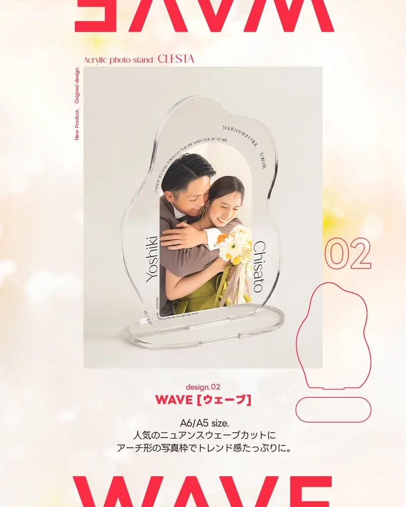 WAVEはニュアンスウェーブカットを取り入れたアーチ状フォルムが特徴です。柔らかな曲線が写真にリズムを与え、トレンド感のある見え方を実現します。