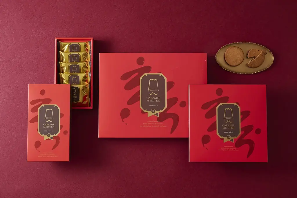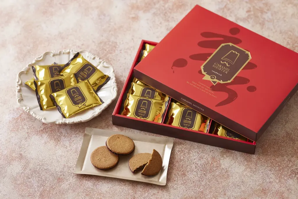 CARAMEL MEISTERは東京駅発のスイーツブランドで、キャラメルの甘さとほろ苦さを引き出したサンドクッキーが主力商品です。独自の製法で融点の異なるチョコレートを用いてキャラメルソースを包み、厚みを持たせたクッキーで挟む構成になっています。