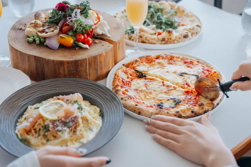 ビュッフェ内容は窯焼きピザ(5種類)と、パスタやサラダ、スープを含むアンティパスト(15種類)を合わせた全20種類が食べ放題です。石窯から焼きたてのピザが次々と提供されるライブ感を重視した構成です。