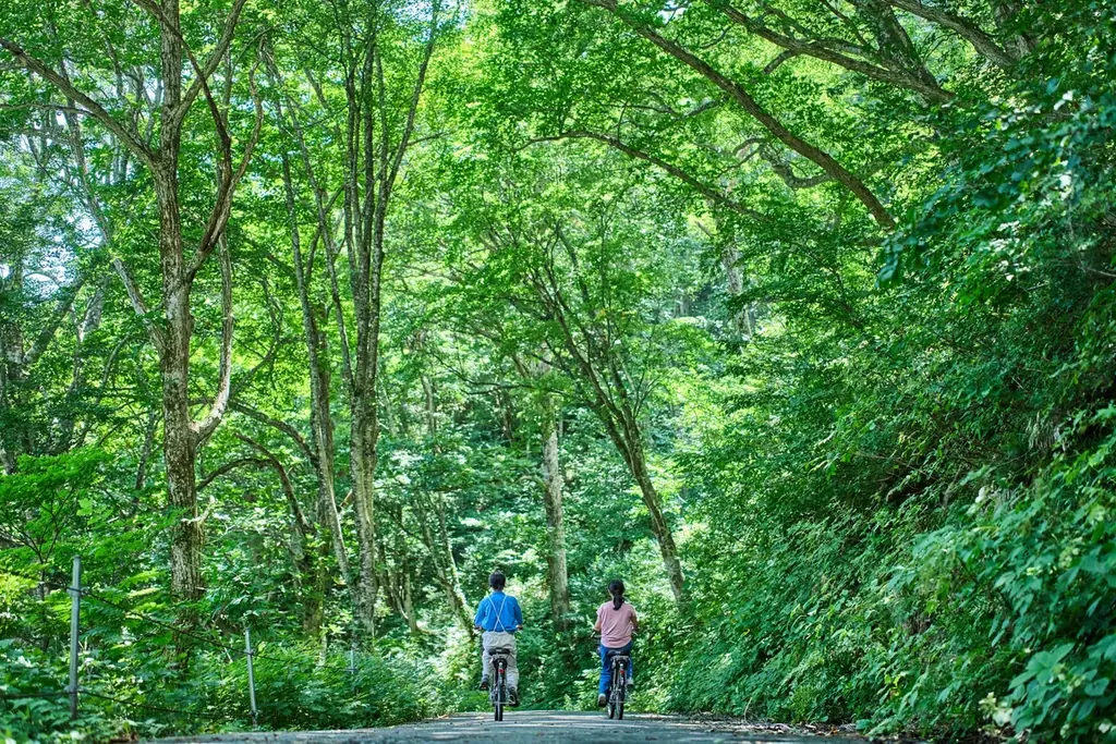 目的地までのルートは舗装されたおよそ3kmの平坦路で、電動アシスト付き自転車で移動します。マイカー規制があるため、徒歩や自転車での移動が主となります。沿道はブナやサワグルミの木立が続き、森林浴を伴う快適な移動が可能です。