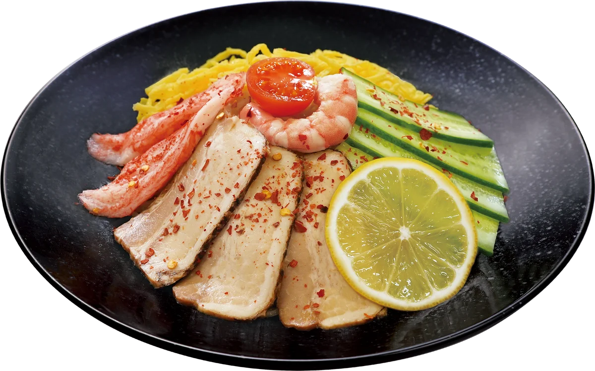 基本となる「冷し中華」は、北海道産小麦を使用した自社製のモチモチした麺をキリッと冷やし、レモンの風味が爽やかに香る味わいに仕上げています。香ばしい炭火焼焼豚(チャーシュー)やプリプリのエビといった贅沢な具材がたっぷり載り、ほどよい甘さとレモンの酸味のバランスであと味がすっきりする一杯です。