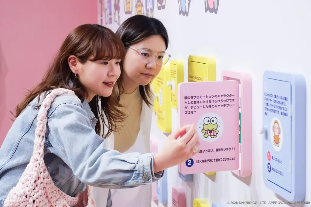 会場全体を通して、サンリオが生み出してきたデザインや商品、機関紙『いちご新聞』などの資料を通して、企業の思想や制作背景、ファンとの関係性を多角的に解説します。来場者は観覧しながら参加できる100問のクイズなど、展示鑑賞を能動的にする仕掛けにも触れることができます。