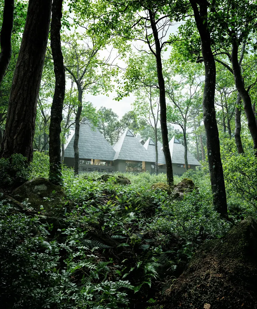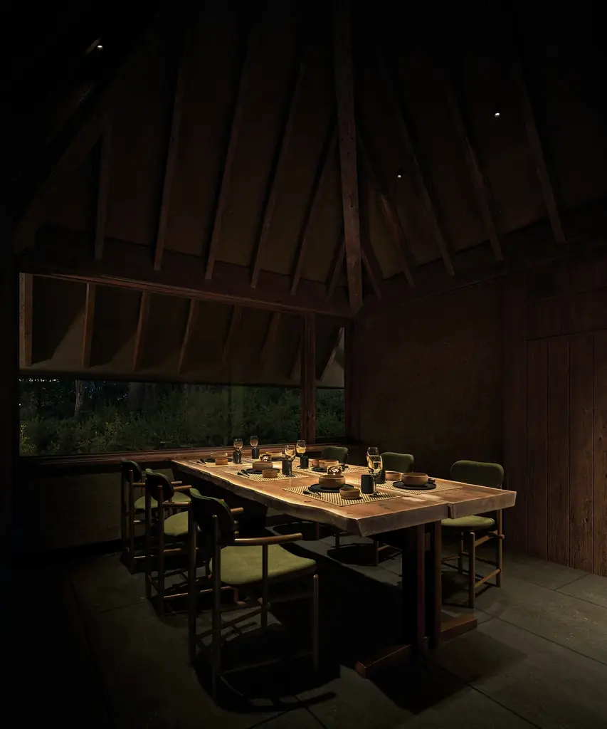 建築設計は株式会社NAP建築設計事務所の中村拓志氏、インテリアデザインはJamo Associatesが担当しています。建物は森に溶け込むように設計され、光や風、木漏れ日が室内へ静かに流れ込むことで、滞在者の感覚が段階的にゆるやかに整うことを意図しています。