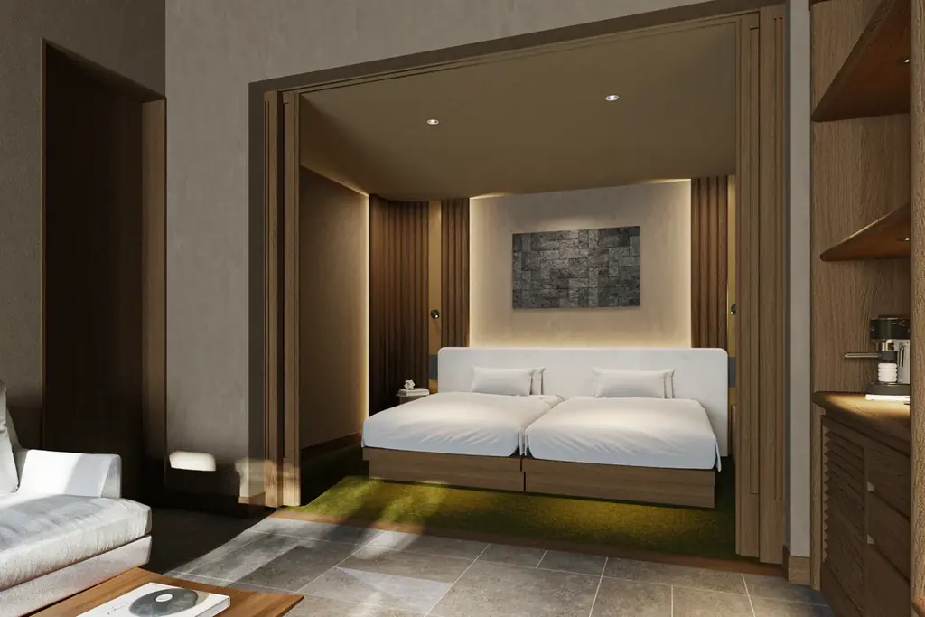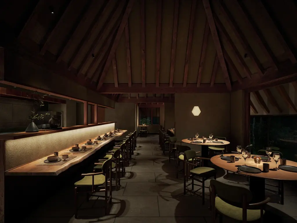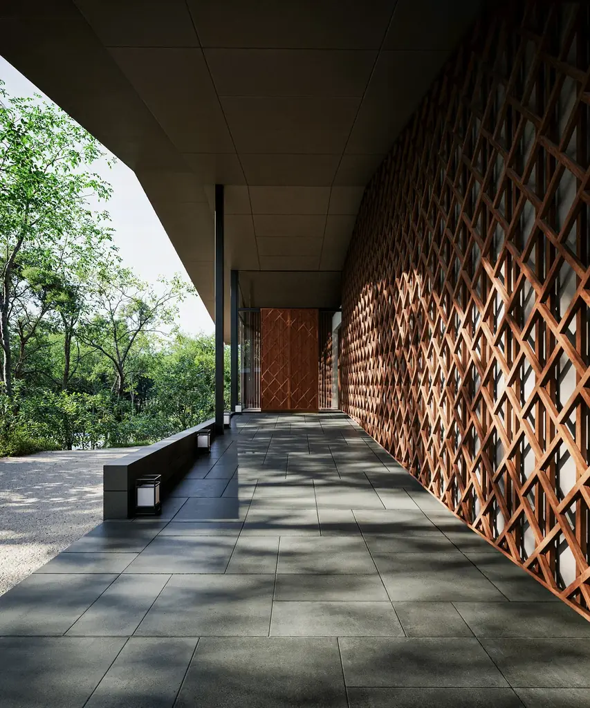 空間思想には日本文化に根差す「真・行・草」の考えが反映されています。都市の緊張感を残す「真」では低い軒や縦格子が迎え、「行」では回廊や客室棟に差し込む木漏れ日が歩行者へ落ち着きを与えます。「草」ではテラスやアウトドアダイニングを通じて森の空気と完全に響き合う領域をつくり、視覚と触覚、嗅覚が森と一体となる体験を目指します。