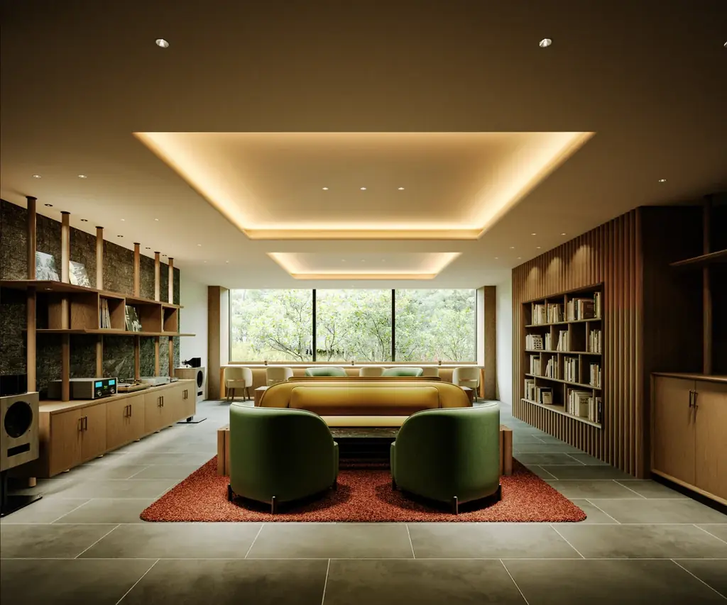 また、宿泊者専用ラウンジにはプレミアムサウンドが流れ、軽食やドリンク、夜間のアルコール提供も行います。ラウンジやミュージックラウンジは、滞在の始まりから終わりまで思考をほどき感覚を整える時間を支える場として設えられています。