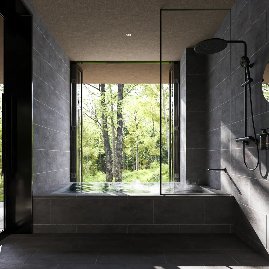 室内は軽井沢の四季を映す色彩(春の若草色、夏の深緑、秋の黄金色、冬の淡い白)と自然素材を組み合わせ、浅間山の浅間石やカラマツの丸太などを取り入れて森の立体感を表現しています。バスルームやサウナでは窓を開けることで外気浴が可能となり、森の香りと風が直接室内に流れ込みます。