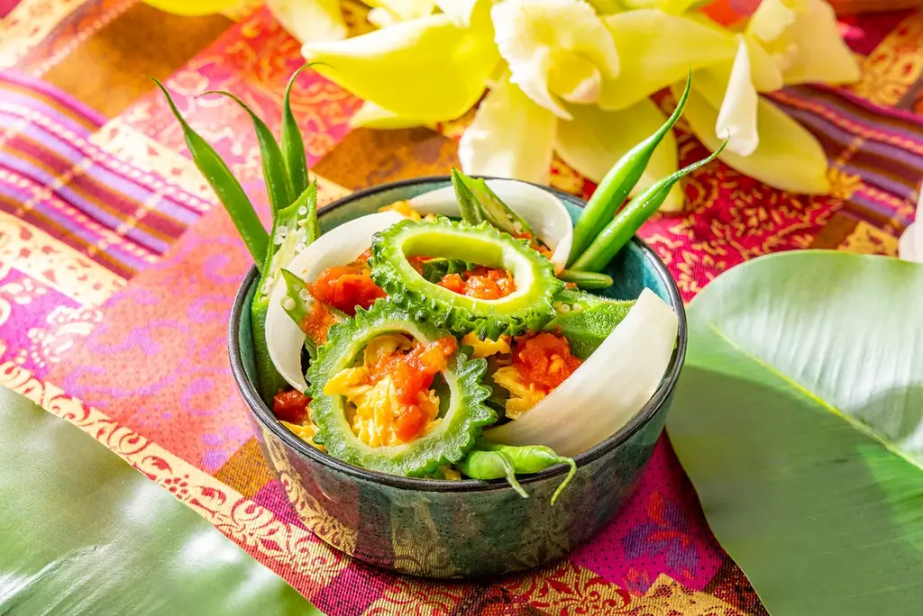 - フィリピン風ゴーヤチャンプル:卵、トマト、魚醤で仕上げたアジアンテイストのゴーヤ料理。