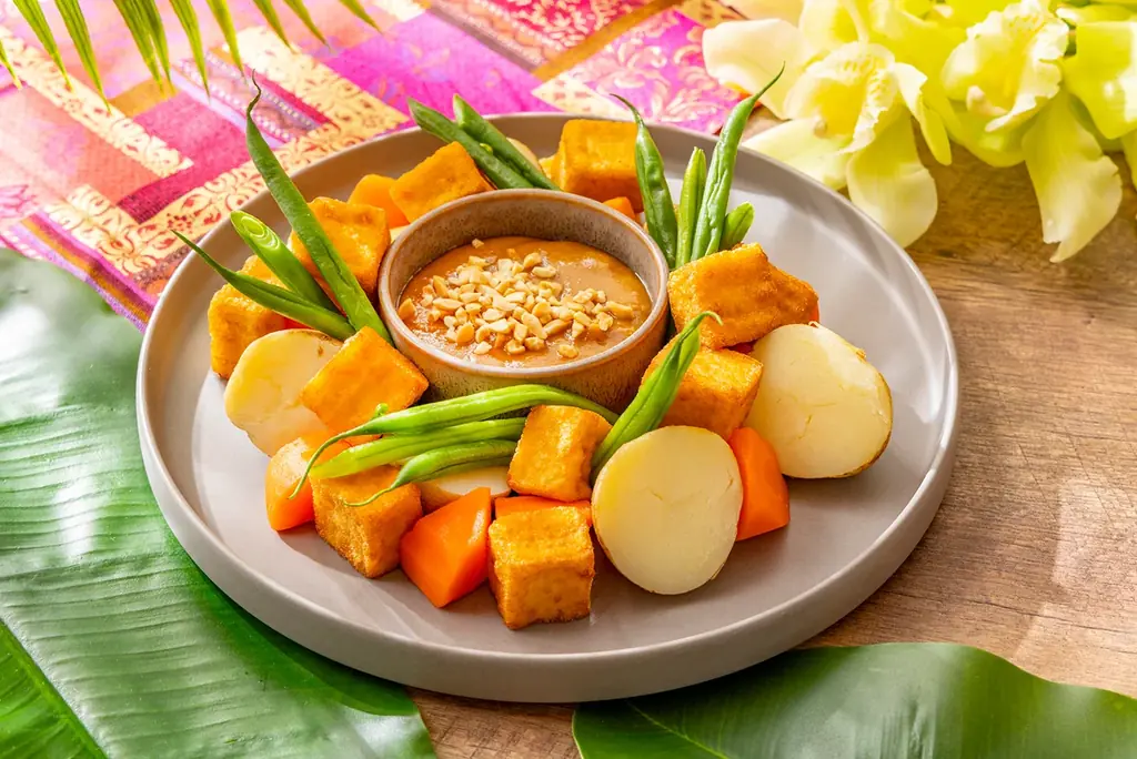 - 厚揚げと野菜のガドガド:温野菜と厚揚げにピーナッツソースをかけるインドネシア料理。