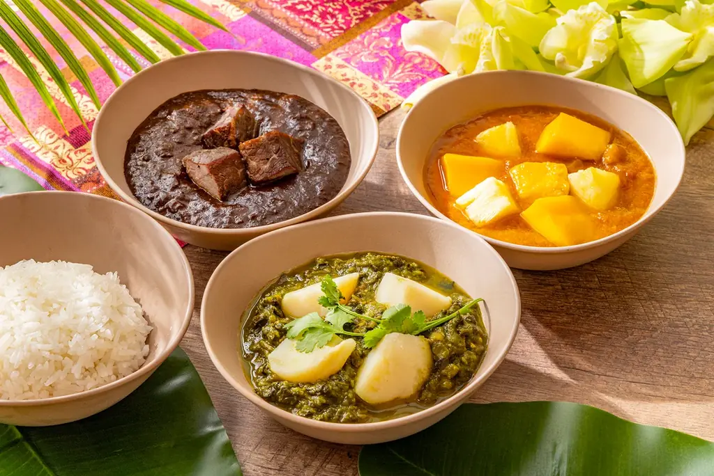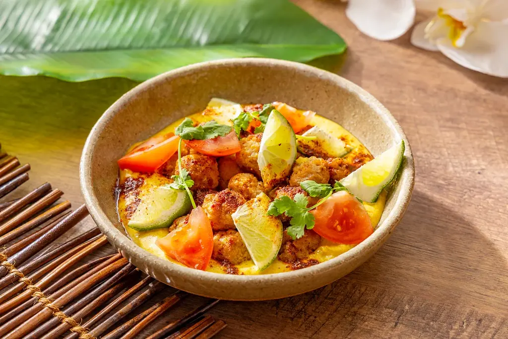- ジャークミートボール ココナツカレーソース:ジャークシーズニングで風味づけしたミートボールをココナッツカレーで。