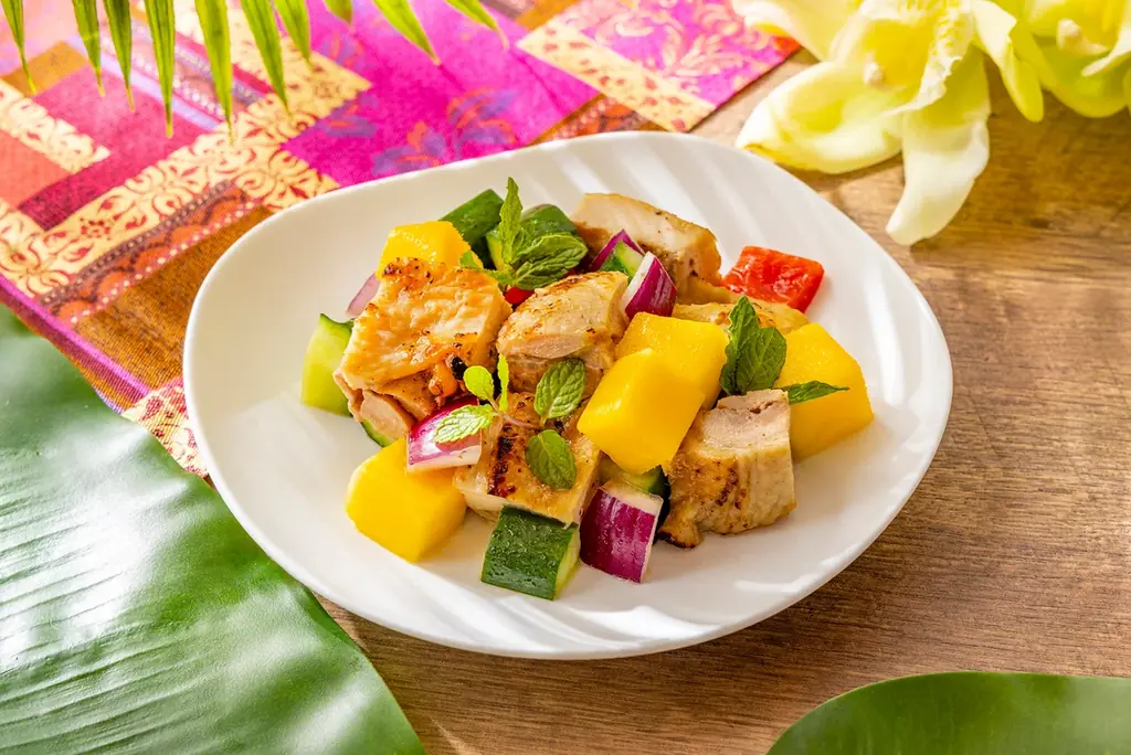 - ジャークチキンとマンゴーのサルサ:スパイシーな鶏肉に甘酸っぱいマンゴーサルサを添える。