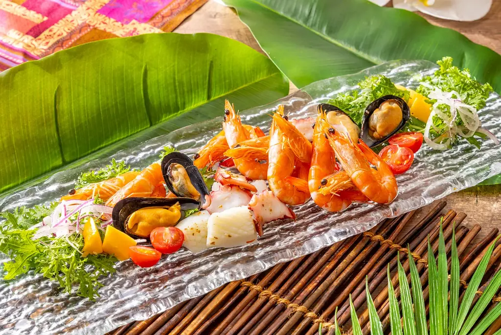 - ココナッツアイランド風シーフードサラダ:ナンプラー、ライム、レモングラスで南国の香りをまとわせたシーフード。