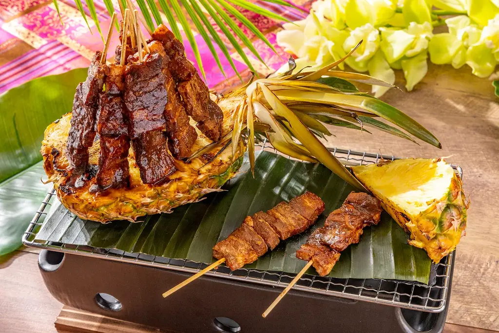 - ポークの串焼き インドネシア風:サテを豚肉でアレンジし、特製の甘辛だれとパイナップルで仕上げ。