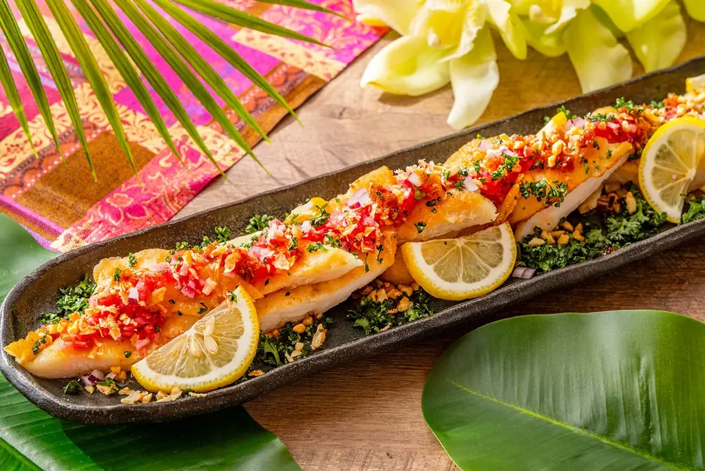- ベトナム風焼き魚 サテトムライムソース:ナンプラー等でマリネした白身魚に、海老旨味のサテトムとライムのソースを合わせる。