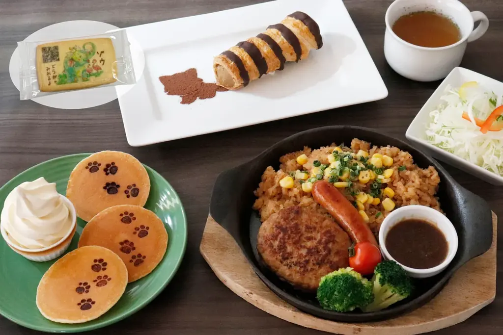 | コラボメニュー(代表) | 飼育員さんのスタミナ飯(1,450円)、レッサーパンダの尻尾(620円)、肉球パンケーキ(580円)※各メニューにQRサブレ付き |