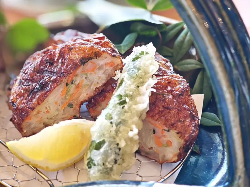 - 鳴門(会席料理):春にんじんと淡路島玉ねぎの平天/春にんじんと鳴門鯛の東寺揚げ