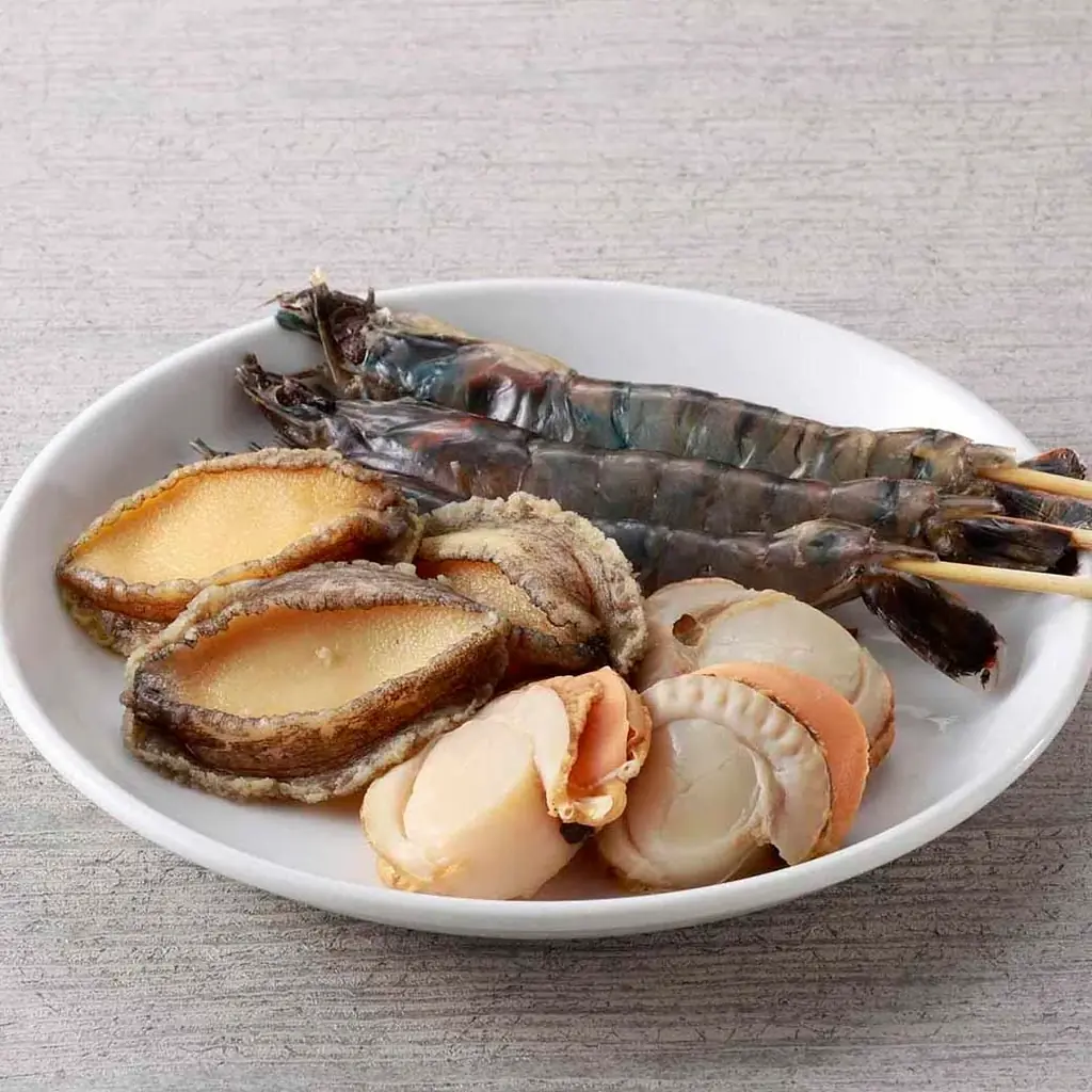 - 海鮮:串つきブラックタイガー、アワビ、北海道産ホタテ